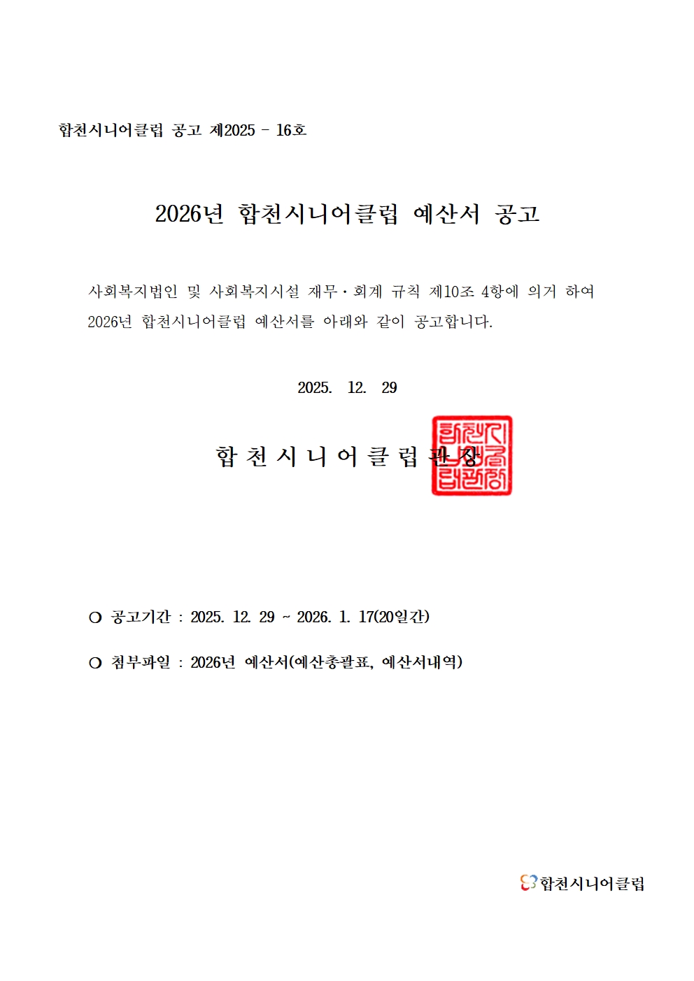 2026년 합천시니어클럽 예산서 공고